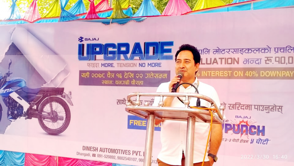 दिनेश अटोमोटिभ्स प्रालि धनगढीके आयोजनामे यिहे चैत १६ से २२ गतेसम बजाज एक्सचेन्ज महामेला सुरु हुइल बा ।