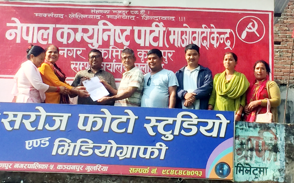 नेकपा माओवादी केन्द्रके कृष्णपुर नगर कमिटी अध्यक्ष जोगराज चौधरी राजनीतिक पार्टीहुक्रे स्थानीयतहके निर्वाचनहे मध्येनजर करके तयार पर्ना घोषणापत्रके विषयमे महत्वपुर्ण सुझाव मानवअधिकार समुहसे अपन पार्टीहे डेहलमे धन्यवाद डेटी स्थानीय पार्टी कमिटीके सुझावके आधारमे पार्टी मुख्यालयसे घोषणापत्र तयार पर्ना हुइल ओरसे पालिकास्तरके पार्टी कमिटीसे डेना सुझावमे उल्लेखित सुझावहे समावेश कैना प्रतिवद्धता जनैलै ।