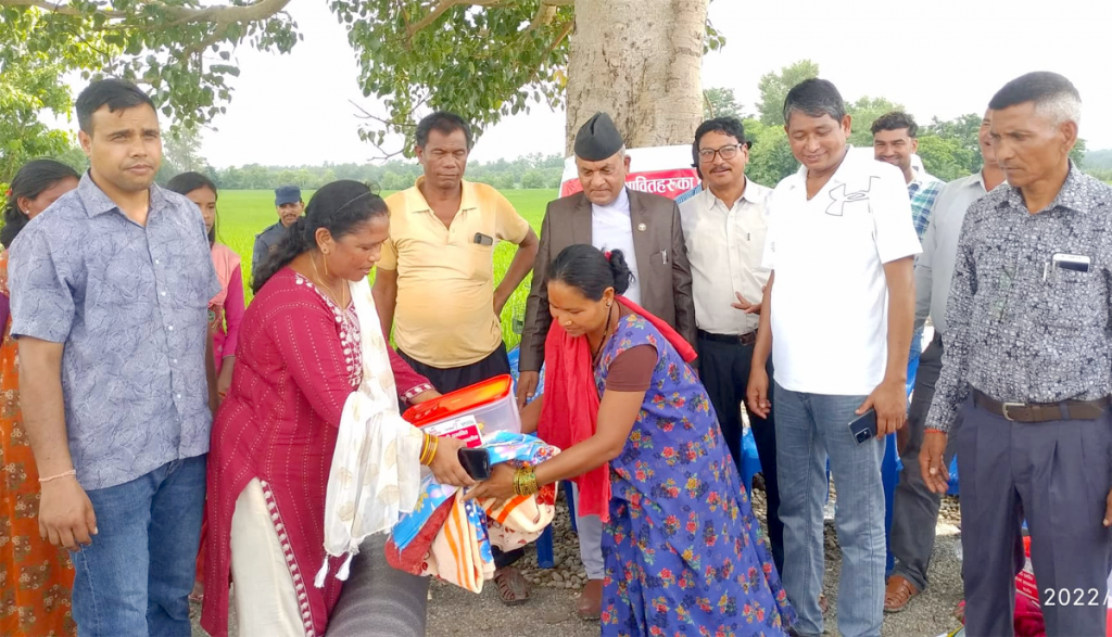 बाढ पीडितहुकनहुकनहे सामाजिक विकास राज्यमन्त्री टेकबहादुर रैका, कैलारी गाउँपालिका अध्यक्ष राजसमझ चौधरी, गाउँपालिका उपाध्यक्ष भगवतीकुमारी चौधरी, नेपाली काँग्रेस कैलालीके कार्यवाहक सभापति खेमराज डगौंरा, वडा नम्बर–३ के अध्यक्ष सन्तराम चौधरी, नेपाली काँग्रेस घोडाघोडी नगरपालिका सभापति बमबहादुर सिंह, नेपाली काँग्रेसके महासमिति सदस्य रामचरण चौधरी, नेपाली काँग्रेस कैलारी सभापति कृष्णप्रसाद चौधरी, नेपाली काँग्रेस कैलारी सचिव मिना चौधरी, सामाजिक विकास राज्यमन्त्री टेकबहादुर रैकाके स्वकीय सचिव राजेन्द्र रैका लगायतसे उ सामाग्री वितरण करल रहिट ।