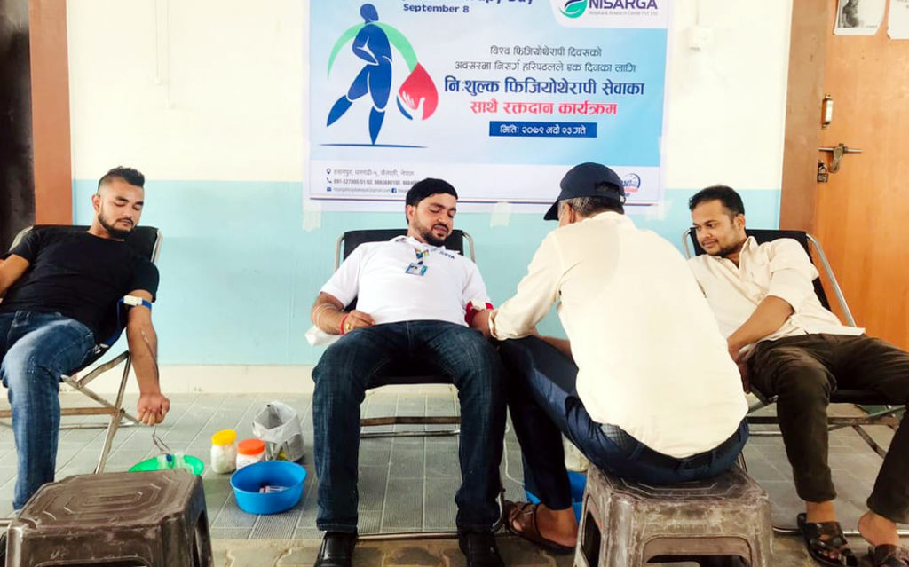 विश्व फिजियोथेरापी दिवसके अवसरमे आयोजित रक्तदान कार्यक्रममे हस्पिटलमे कार्यरत २१ जाने कर्मचारी रक्तदानकरले रहैं । उ अवसरमे ४७ जाने फिजियोथेरापीके बिरामीहुकनहे निःशुल्क सेवा प्रदान फेन करल हस्पिटलके फिजियोथेरापीस्ट डाक्टर नबिन ढुंगाना जानकारी डेलैं ।