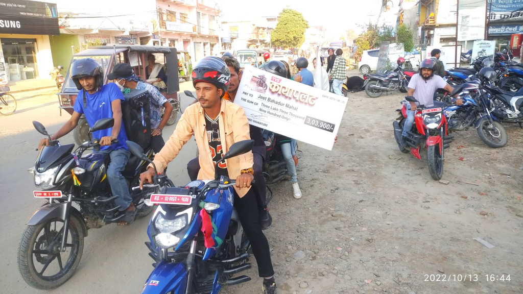 विफेक रोज एक कार्यक्रमके बीच शोरुमसे विजेता महतहे फुल क्यास ब्याक पाइलमे खरिद रकम बराबरके चेक हस्तान्तरण करले बा । चेक हस्तान्तरणपाछे बागेश्वरी अटोमोटिभ्ससे विजेता महतसहित धनगढी चौराहसे मोतीचोकसम मोटरसाइकल ¥यालीसमेत निकरले बा ।