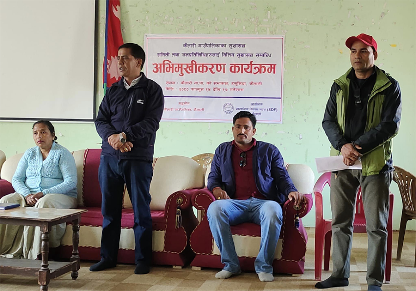 सामाजिक विकास मञ्चके आयोजना तथा गाउँपालिकाके आर्थिक सहयोगमे सुशासन समिति तथा जनप्रतिनिधिहुकनके लाग फागुन १४ गतेसे सुरु हुइल वित्तिय सुशासन सम्बन्धी अभिमुखीकरण तालिम विफेक रोज सम्पन्न हुइल बा ।