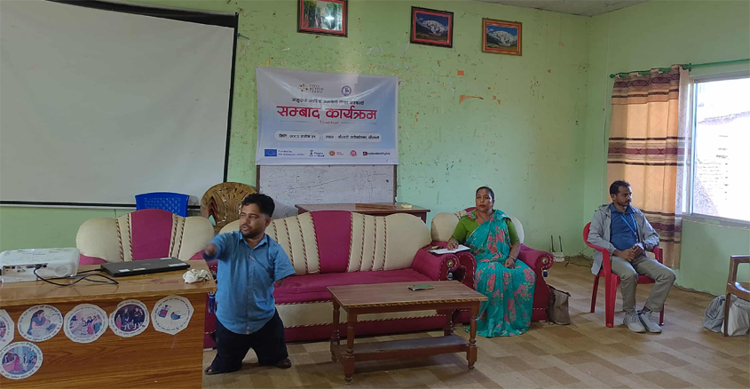 कार्यक्रममे सर्वाङिण अपाङता विकास समाज नेपालके कार्यकारी निर्देशक नन्दराज भट्ट संस्था परियोजनासे कैलारी गाउँपालिकामे करटी गतिविधि जानकारी डेहल रहिट । परियोजनासे सामुदायिक बैठक, प्रत्यक्ष भेटघाट, टाउन होटल बैठक, फलोअप करल बटैलै । सामुदायिक बैठक आठ चो, प्रत्यक्ष भेटघाट ८० जनहनहे करके सुझाव संकलन करल बटैलै ।