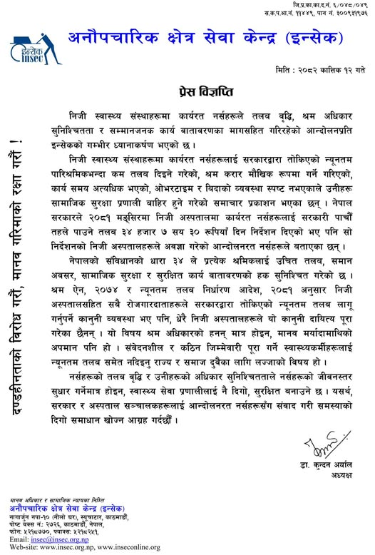 निजी स्वास्थ्य संस्थामे कार्यरत नर्सहुक्रे तलब वृद्धि, श्रम अधिकार सुनिश्चितता ओ सम्मानजनक कार्य वातावरणके मागसहित करटी रहल आन्दोलनप्रति इन्सेकके गम्भीर ध्यानाकर्षण हुइल बा ।
