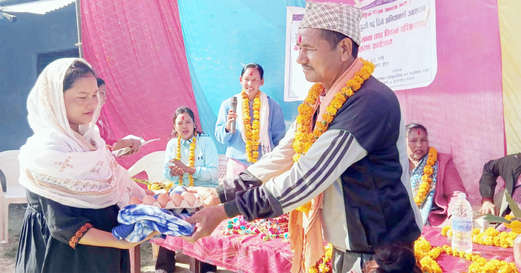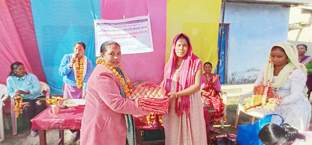 सोम्मारके रोज कैलारी गाउँपालिका वडा नम्बर ७ भुँइयाँफाँटा सामुदायिक वन उपभोक्ता समूसे आयोजित ३४औं अन्तराष्ट्रिय लंैगिक हिंसा विरुद्धके १६ दिने अभियानके अवसरमे गर्भवती महिलाहे पौष्टिक खाना तथा विपन्न परिवारहे डन्डुर कपडा वितरण कार्यक्रमहे सम्बोधन कैटी उहाँ ओइसीन बटाइल हुइटी ।