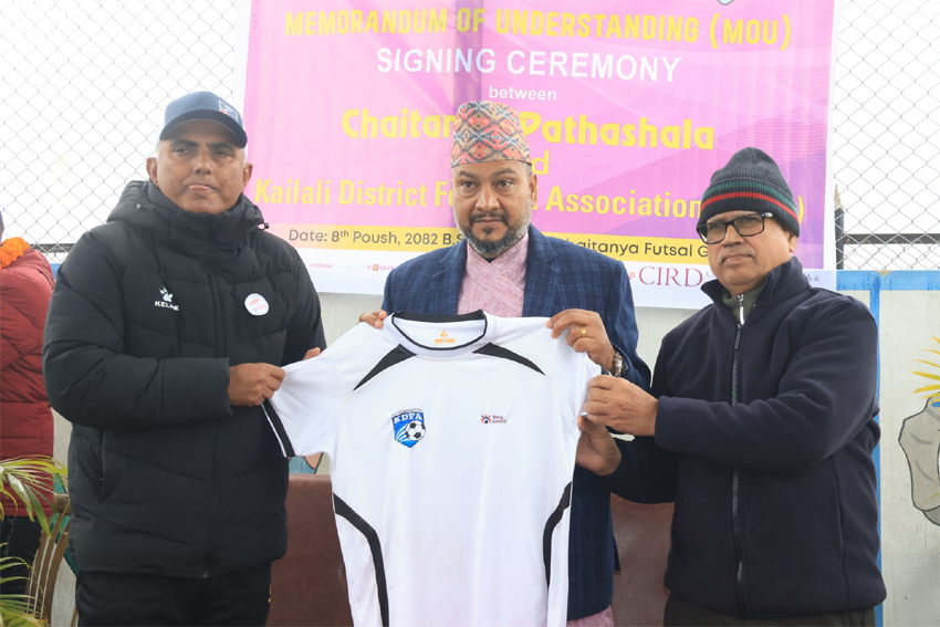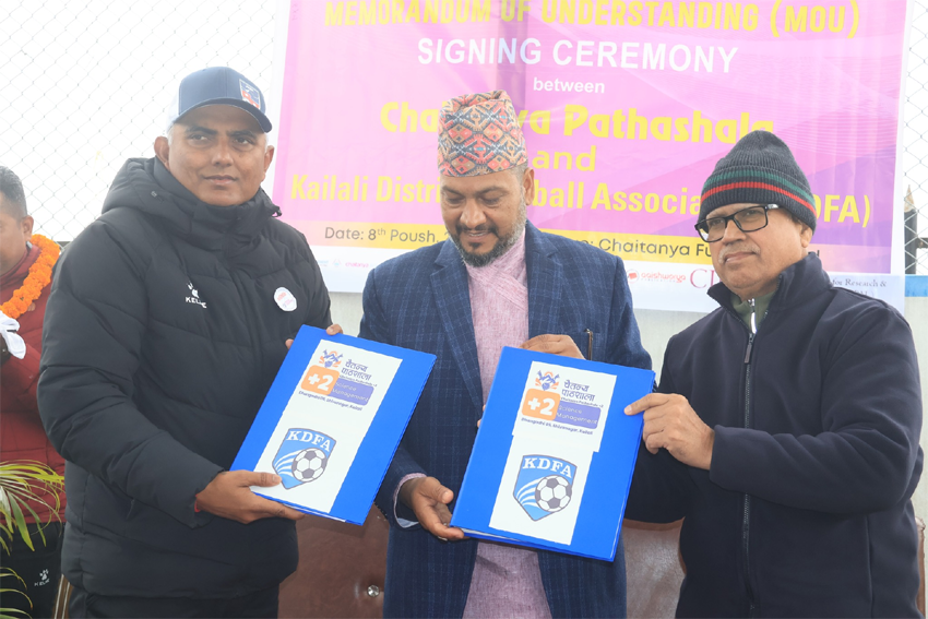 मंगरके रोज आयोजित कार्यक्रममे चैतन्य पाठशालाके अध्यक्ष गणेशप्रसाद जोशी, प्राचार्य प्रेमनिधि ओझा ओ कैलाली जिल्ला फुटबल संघके अध्यक्ष अनिल मल्ल संयुक्त रूपमे हस्ताक्षर करल हुइट ।