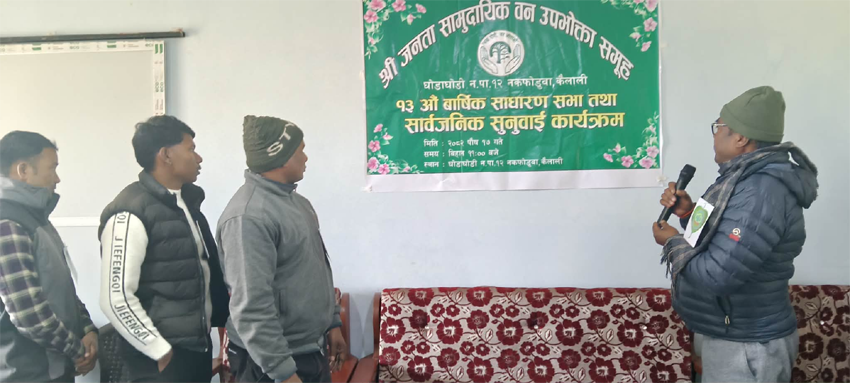 पहलमानपुर, १७ पुस । कैलाली जिल्लाके घोडाघोडी नगरपालिका–१२ नकफोरुवामे रहल जनता सामुदायिक वन उपभोक्ता समूहके १३औं वार्षिक साधारणसभा तथा सार्वजनिक सुनवाई कार्यक्रम विफेक रोज सम्पन्न हुइल बा ।