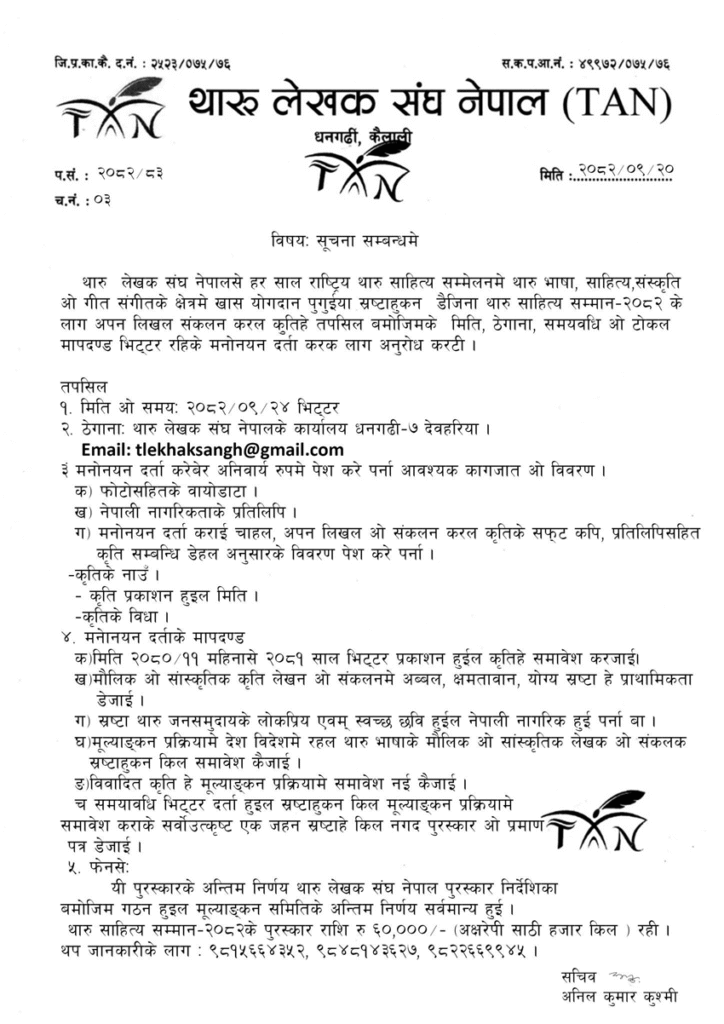 पुरस्कारके लग स्रस्टालोग अपन प्रकाशित हुइल पोस्टा, बायोडाटा इहे पुस २४ गतेसम तभिपजबपकबलनज२नmबष्।िअयm मे पठा सेक्ना जानकारी थारु लेखक संघ नेपालके सचिव अनिल कुश्मीसे हस्ताक्षरित विज्ञप्तिमे बा ।