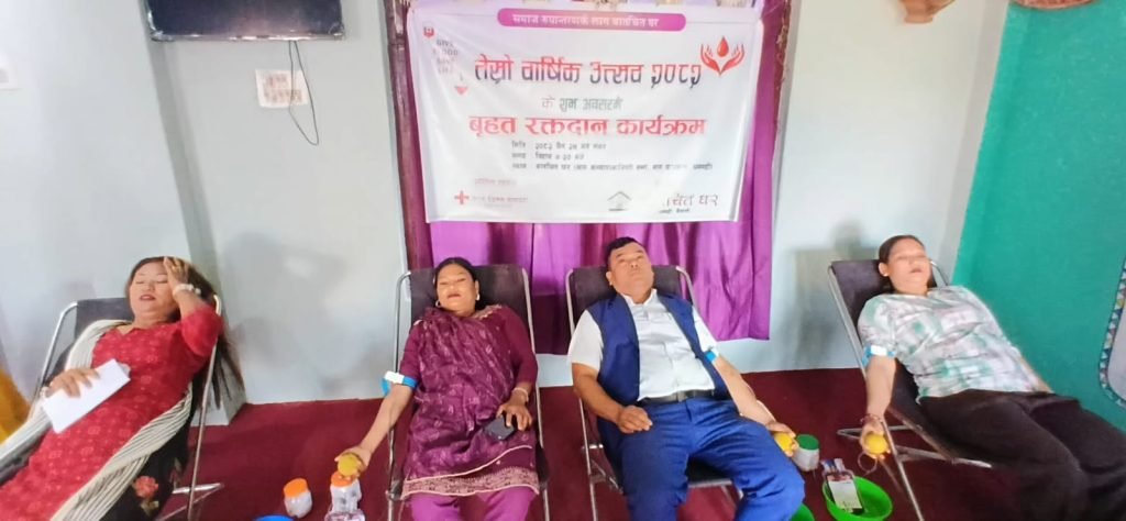 मंगरके रोज वार्षिकोत्सवके अवसरमे वृहत रक्तदान तथा सम्मान कार्यक्रम आयोजना करके मनागिल बा । समाज रुपान्तरण कैना उद्देश्यसे स्थापना हुइल बातचित घरसे वार्षिकोत्सवके अवसरमे रक्तदान कार्यक्रमसहित समाजमे टमान क्षेत्रमे योगदान पुगाइल व्यक्तित्वहे सम्मान समेत करले बा ।