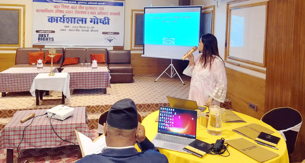 विफेक रोज धनगढीमे जस्ट राइटस फर चिल्डे«नके आर्थिक सहयोगमे व्याकवार्ड सोसाइटी एजुकेशन (वेस) के आयोजनामे बालबालिका न्यायमे पहँुच परियोजना अन्र्तगत विफेक रोज धनगढीमे बालबालिकामे लगानी, सुनिश्चित भविष्यके थालनी कना मूल नाराके साथ बाल विवाह, यौन दुव्र्यहार तथा बालबालिका ओसार पसार रोकथाम ओ बालअधिकार सम्बन्धी कार्यशाला गोष्ठीमे उ बाट बत्वागिल रहे ।